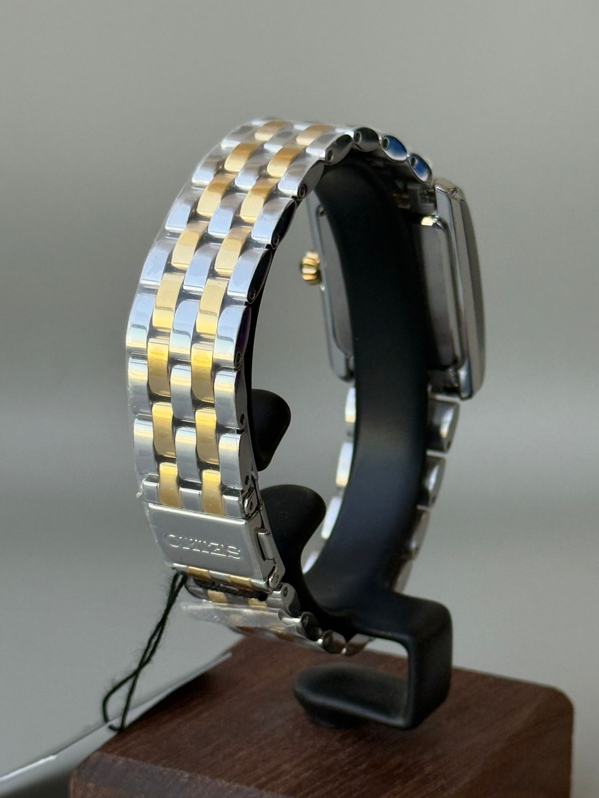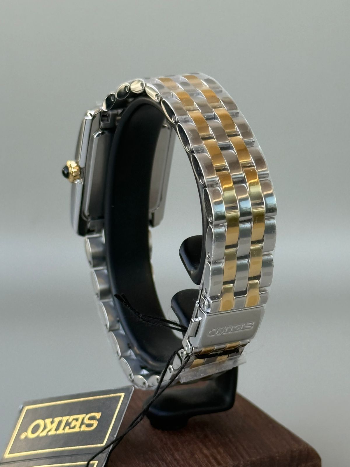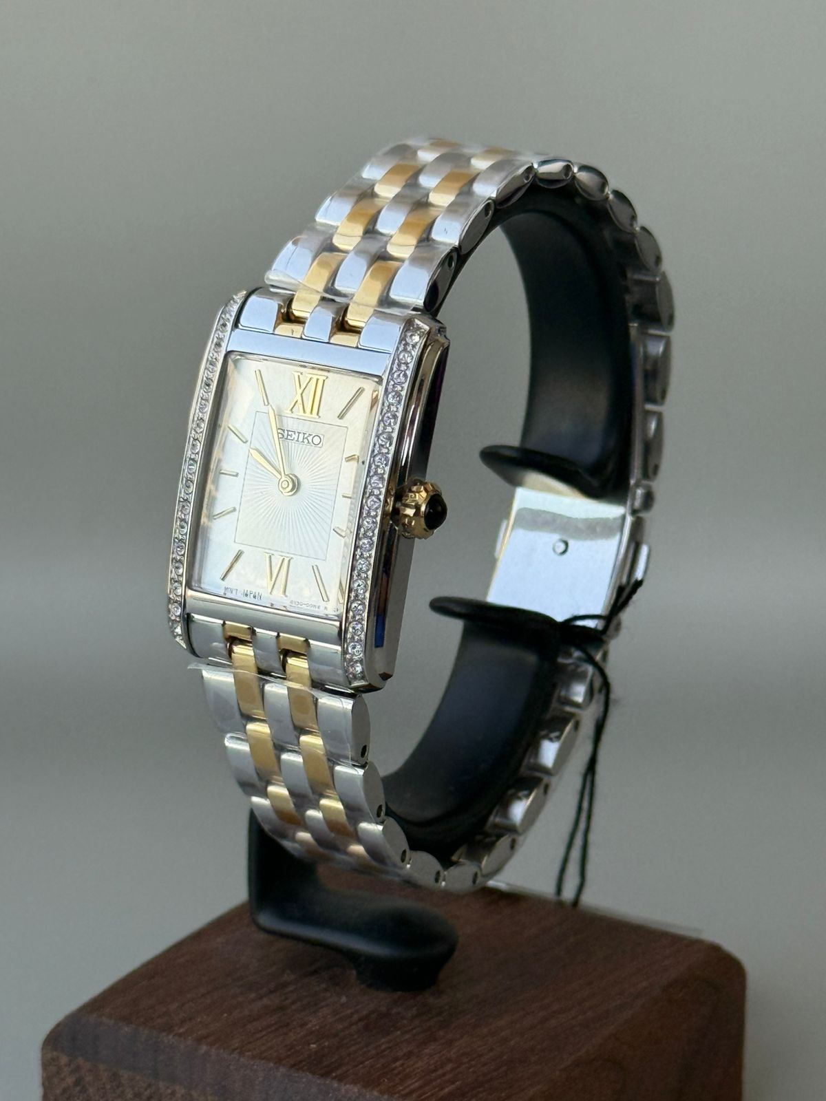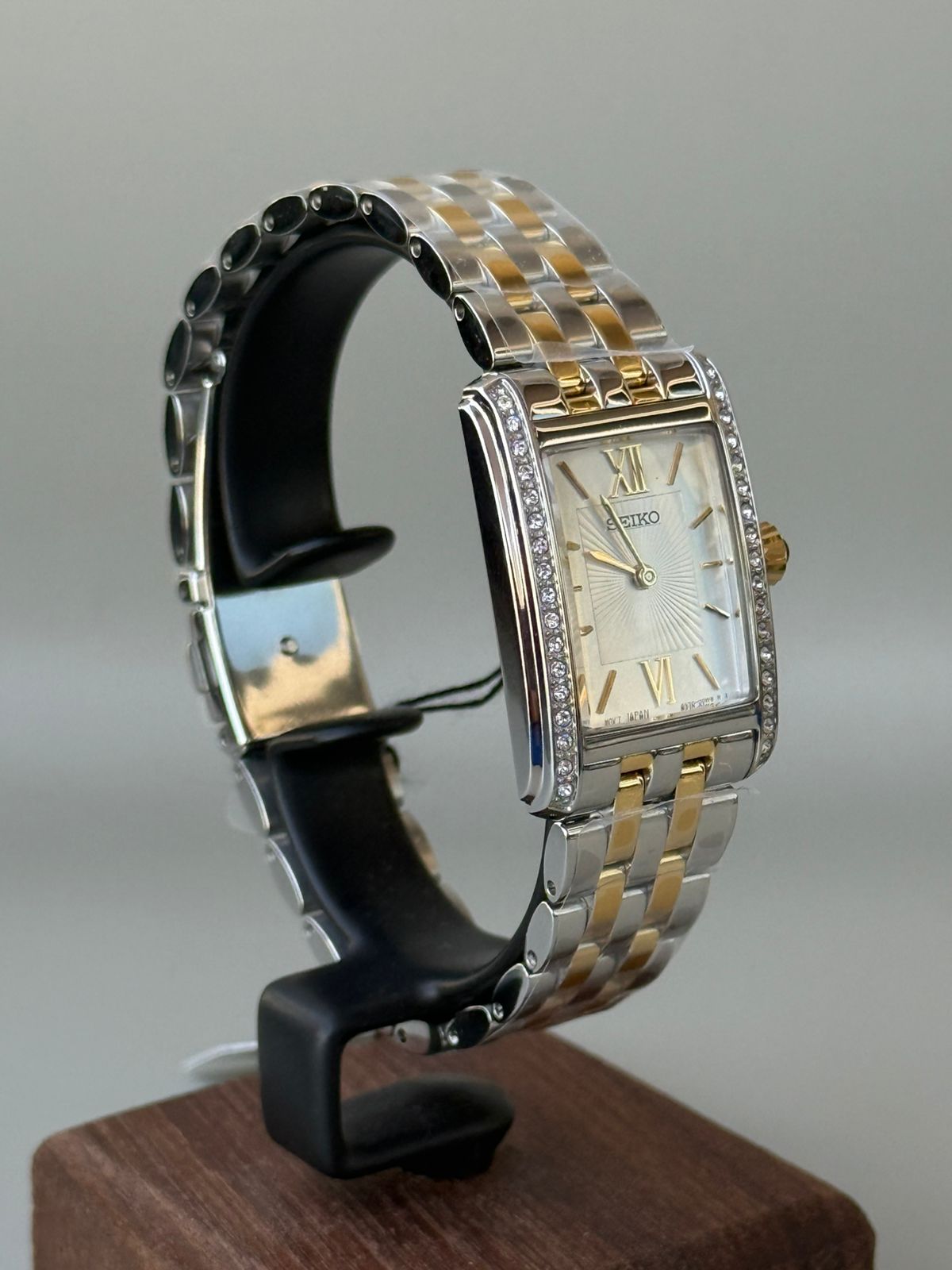 The Seiko SWR093P1 is a women’s classic dress watch known for its elegant, rectangular design and two-tone finish. It features a precise quartz movement and a bezel set with 34 crystals.