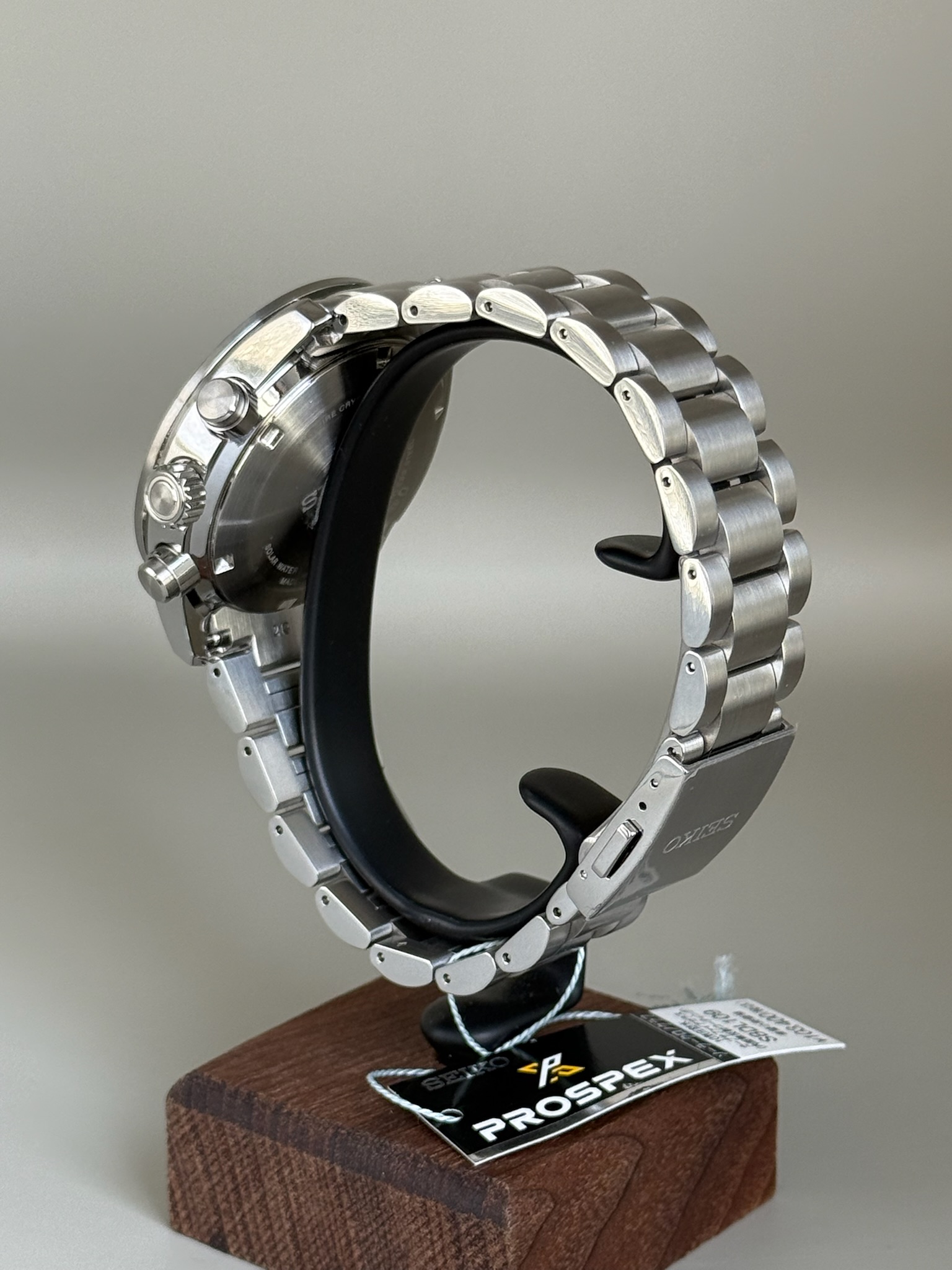 Powered by a solar quartz movement, it charges via light, ensuring eco-friendliness and eliminating the need for battery changes. The light blue dial is paired with black sub-dials for a classic “panda” look, enhancing legibility and style. Lumibrite-coated hands and markers ensure visibility in low light. The chronograph can measure up to 60 minutes in 1/5-second increments, while a date display adds practicality. With 100 meters of water resistance, a sapphire crystal, and a tachymeter bezel, it’s ideal for both active and casual settings. The SBDL109 is a perfect blend of vintage-inspired design and modern solar technology.