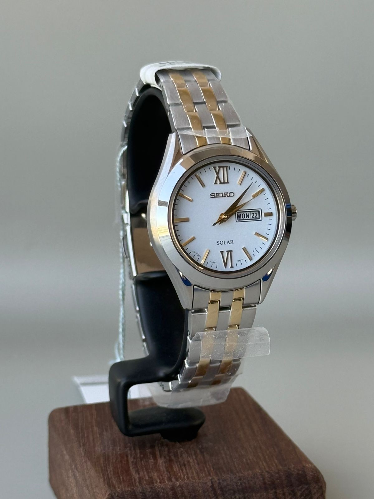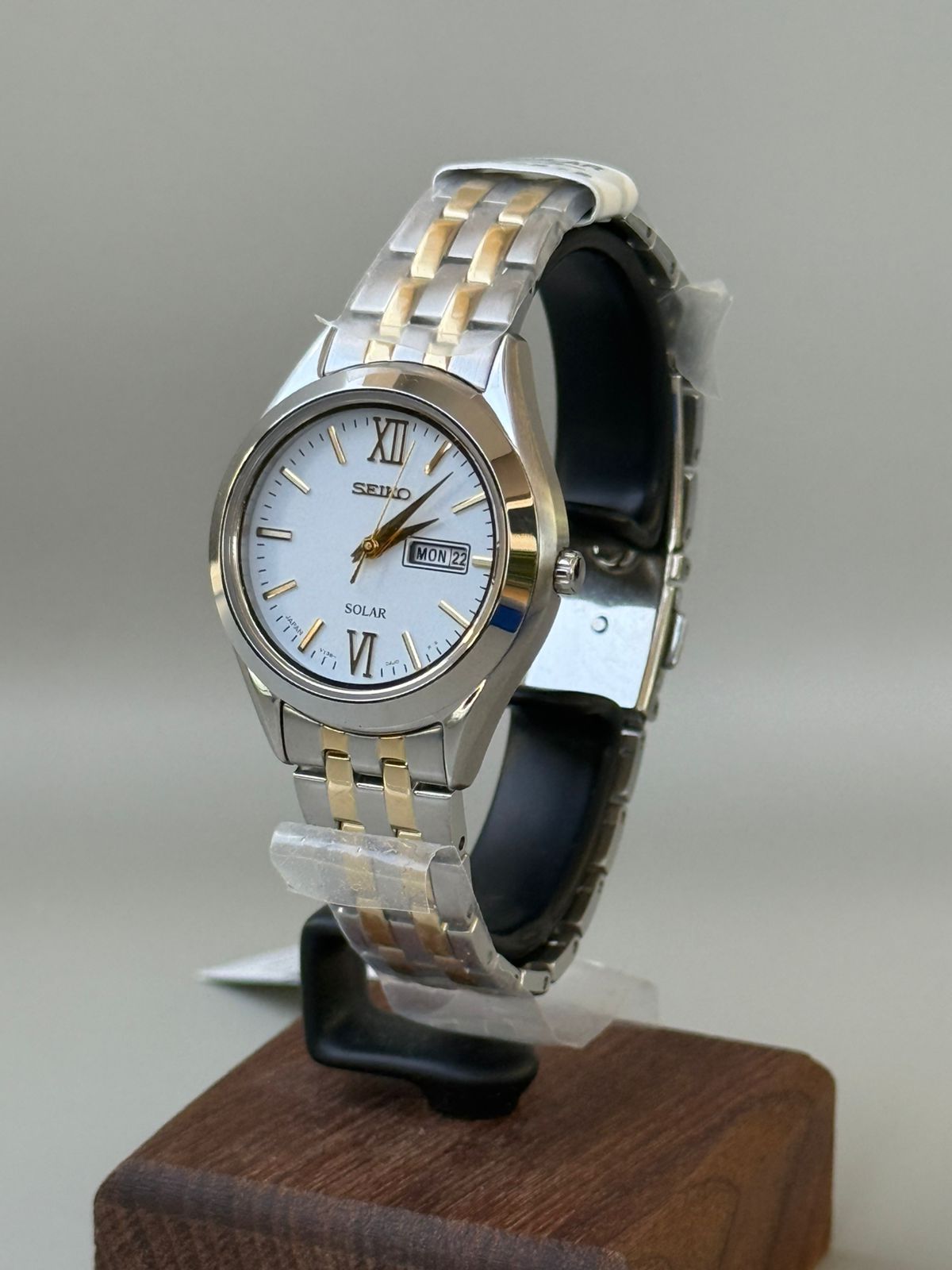 The Seiko STPX033 is a ladies’ solar-powered watch from the Seiko Selection line, featuring a stainless steel case and bracelet (often two-tone silver/gold), a scratch-resistant sapphire crystal, a white dial with day/date display, and 30m water resistance, powered by Caliber V138 movement, offering a 6-month power reserve and ±15 sec/month accuracy.