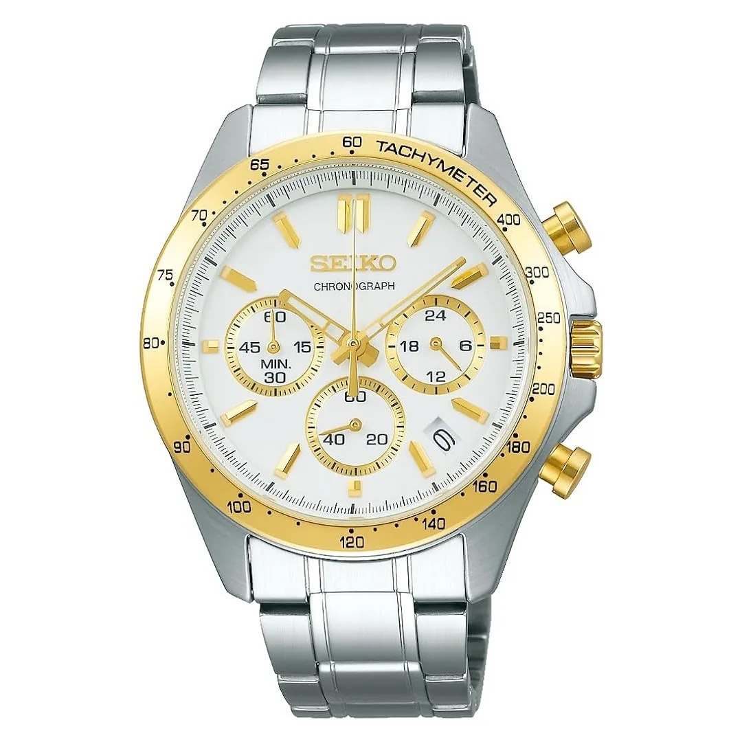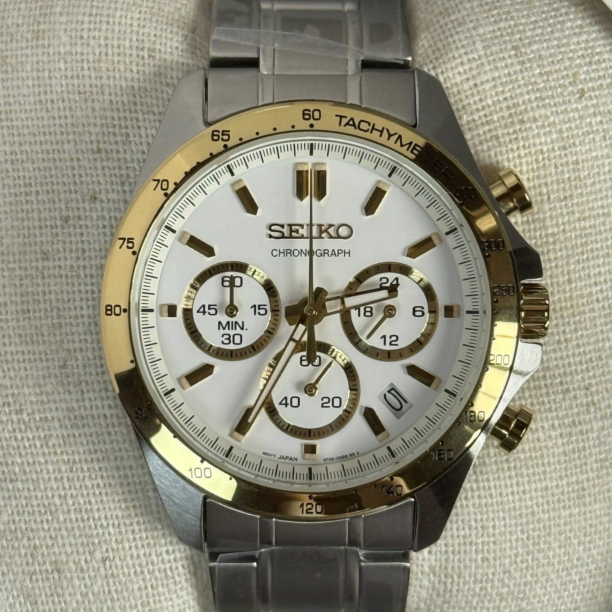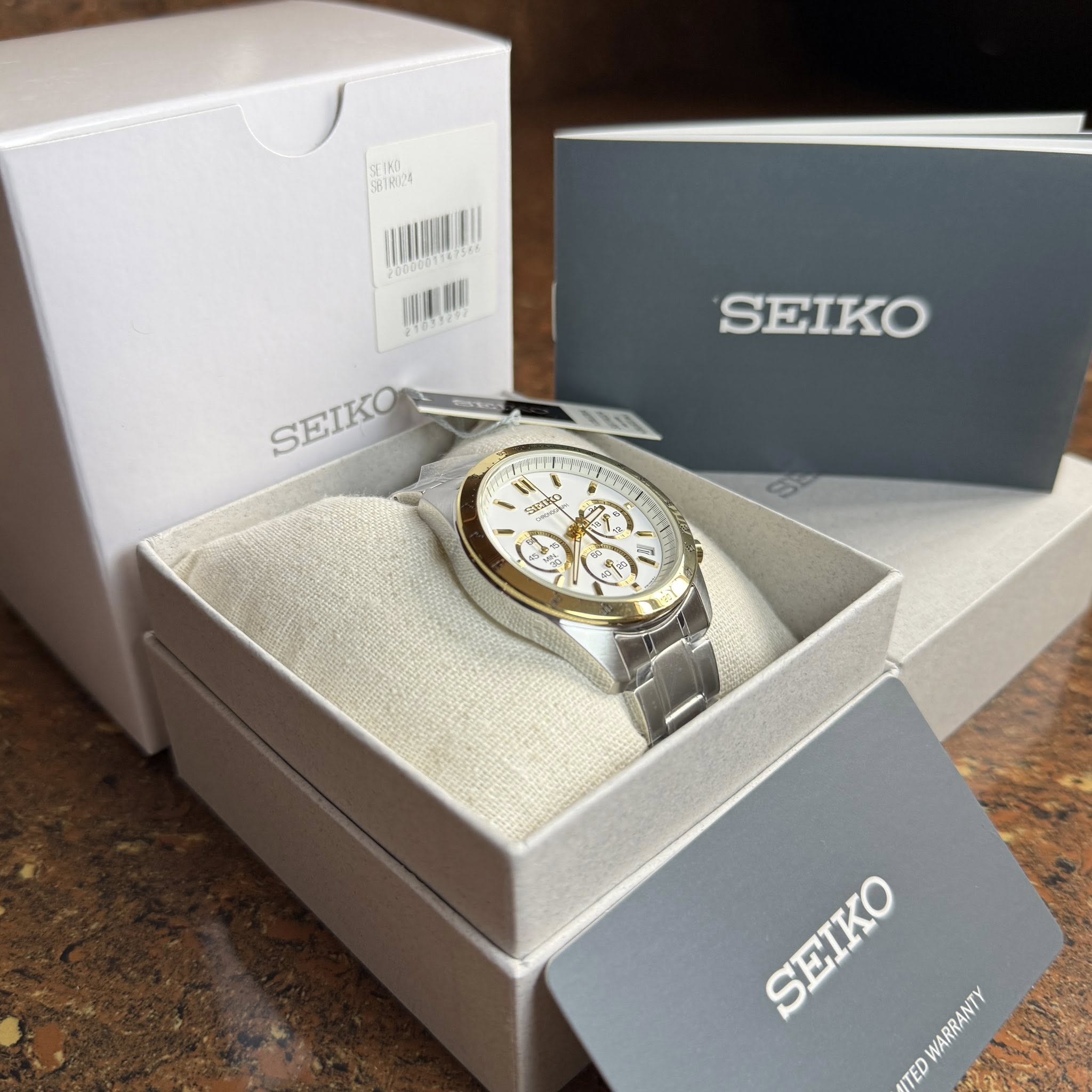 The Seiko Selection SBTR024 is a Japanese Domestic Model (JDM) men’s quartz chronograph featuring a two-tone stainless steel and gold-plated case, white dial, and 100m water resistance. It is powered by the 8T63 movement, offering a 60-minute chronograph, 24-hour subdial, and date display.Â